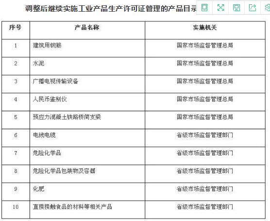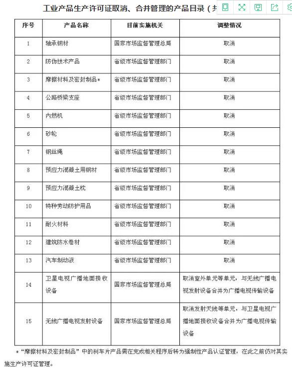 經(jīng)研究論證,國務(wù)院決定,壓減工業(yè)產(chǎn)品生產(chǎn)許可證管理目錄,取消內(nèi)燃機(jī)、汽車制動液等13類工業(yè)產(chǎn)品生產(chǎn)許可證管理,將衛(wèi)星電視廣播地面接收設(shè)備與無線廣播電視發(fā)射設(shè)備2類產(chǎn)品壓減合并為1類,對其中涉及安全、健康、環(huán)保的,轉(zhuǎn)為強(qiáng)制性產(chǎn)品認(rèn)證管理,認(rèn)證費(fèi)用由財(cái)政負(fù)擔(dān)。調(diào)整后繼續(xù)實(shí)施工業(yè)產(chǎn)品生產(chǎn)許可證管理的產(chǎn)品共計(jì)10類,其中,由國家市場監(jiān)督管理總局實(shí)施的5類,由省級市場監(jiān)督管理部門實(shí)施的5類。